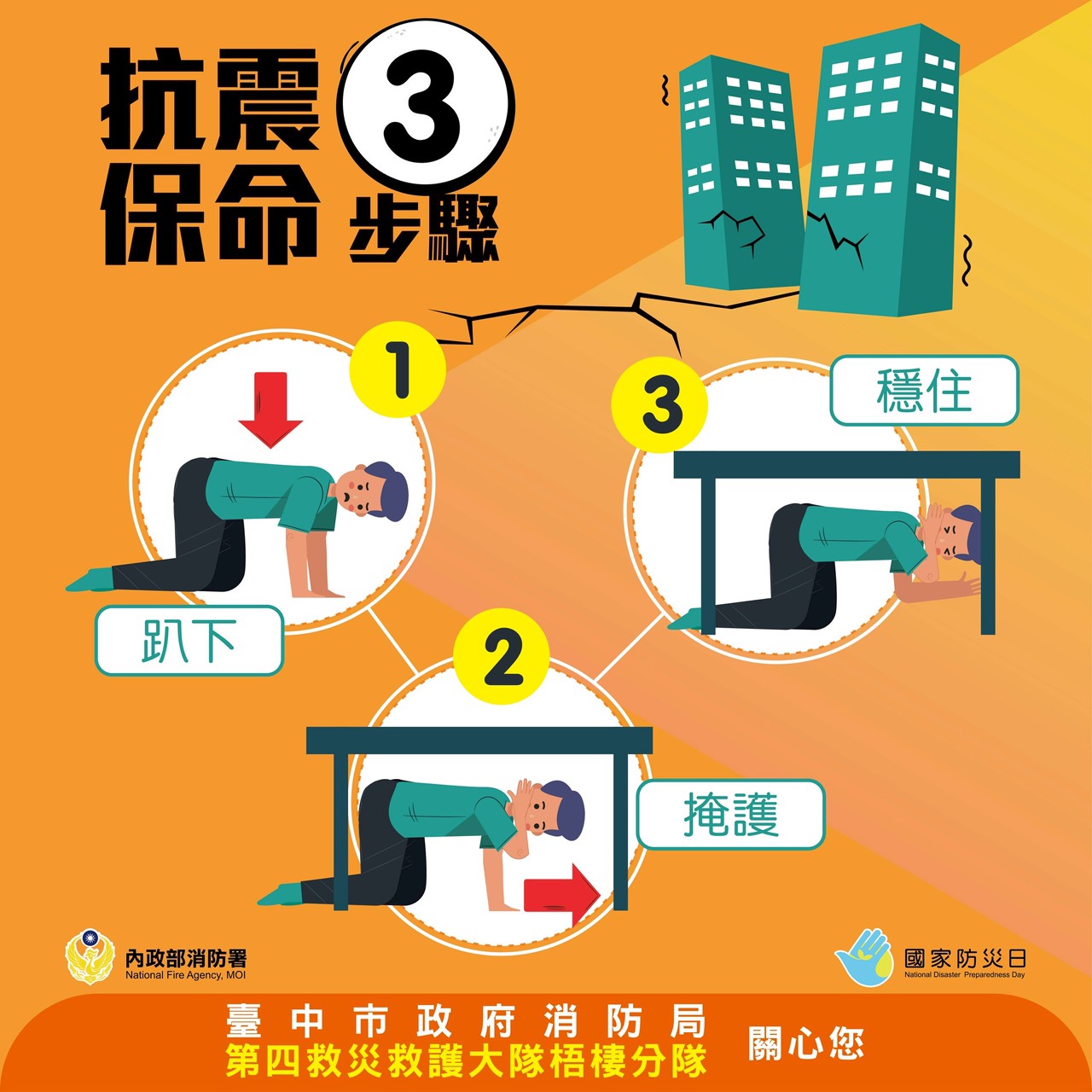 下列為內政部消防署防災專區─防震須知網頁及臺中市政府消防局第四大隊梧棲分隊提供防震宣導圖片