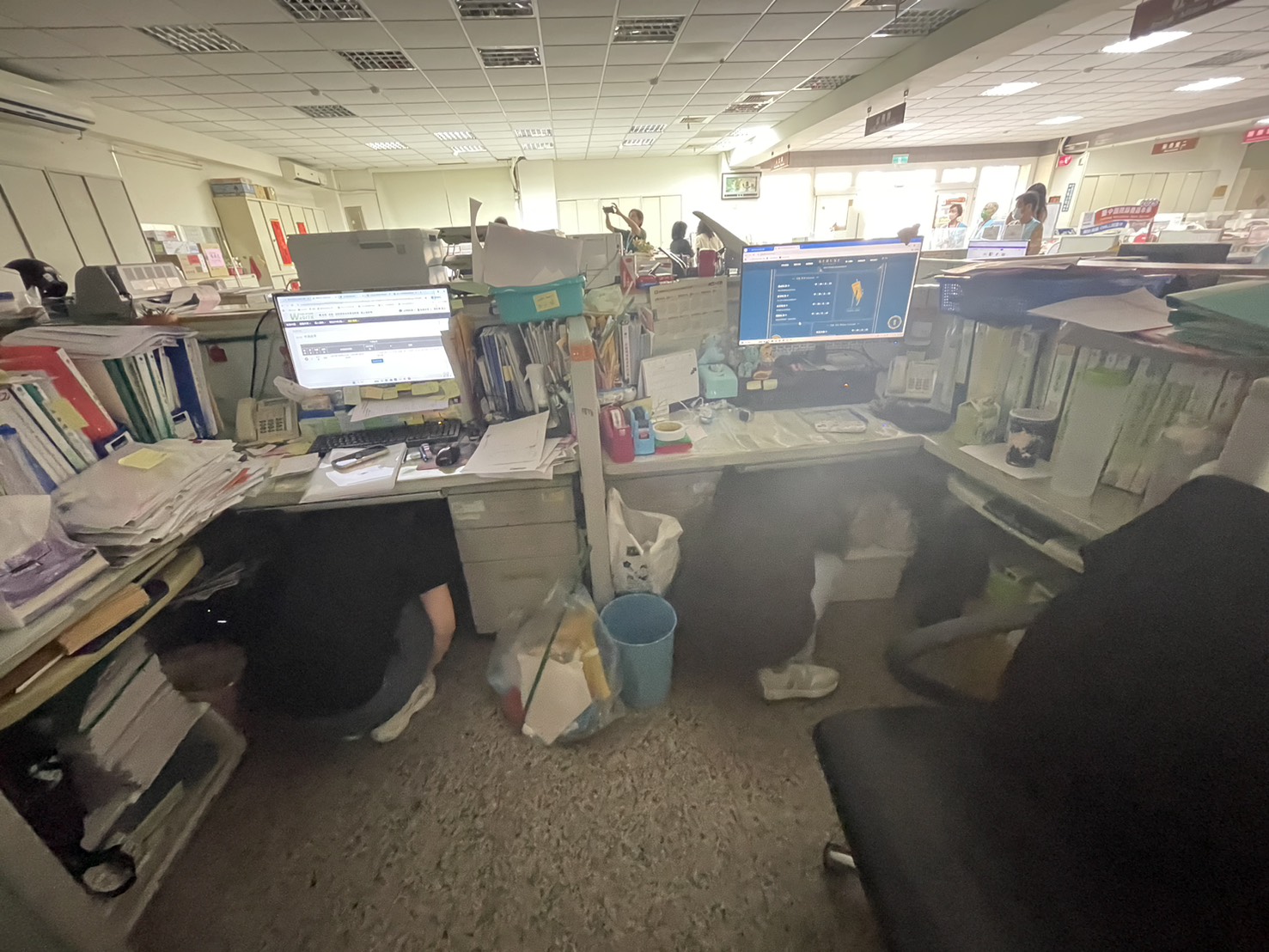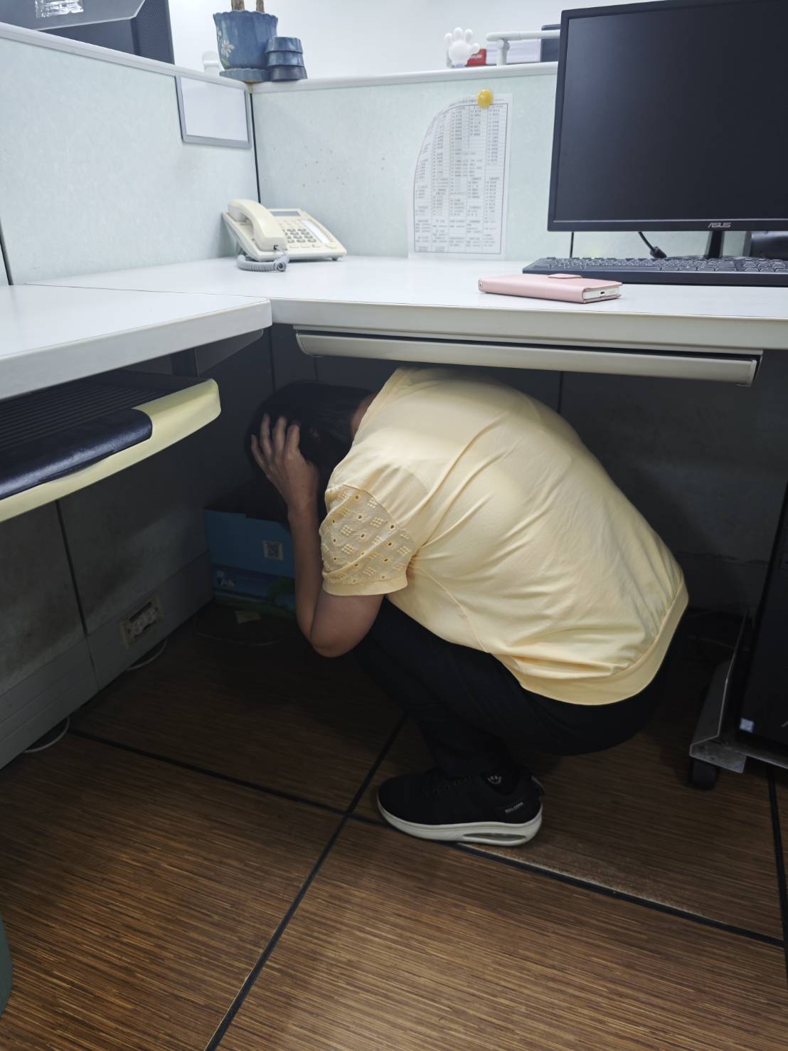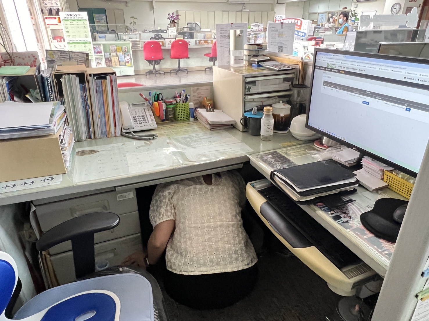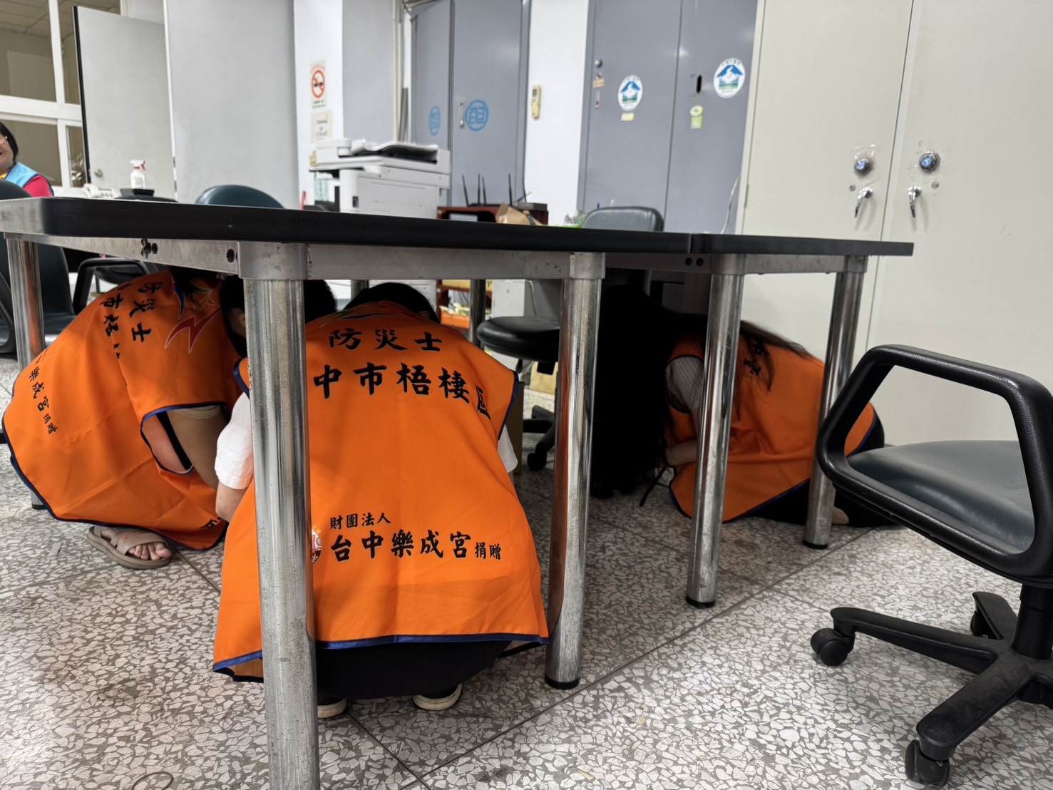 為響應國家防災日-全民地震避難演練暨防災宣導活動,本所同仁進行自主性就地避難演練,地震避難3步驟-趴下、掩護、穩住。