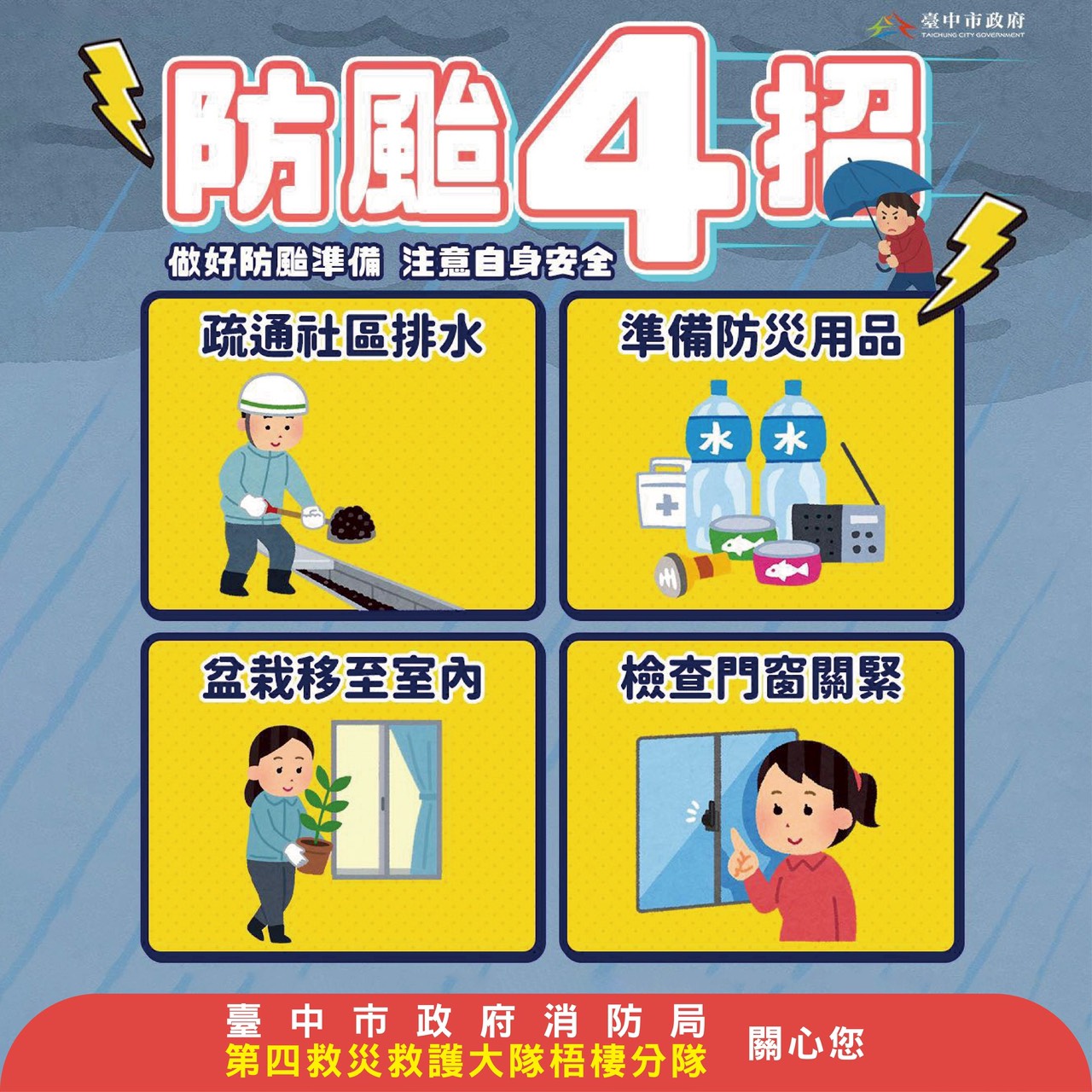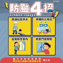 下列為內政部消防署防災專區─防颱宣導網頁及臺中市政府消防局第四大隊梧棲分隊提供防颱宣導圖片