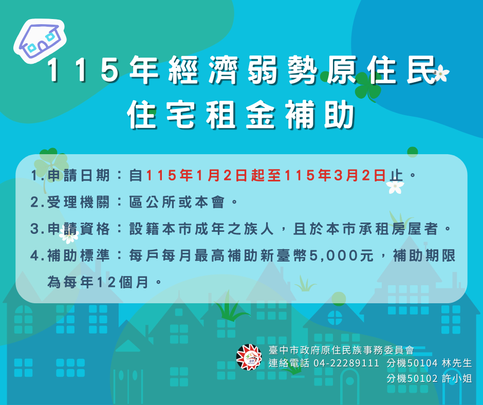 臺中市政府原住民族事務委員會115年度「經濟弱勢原住民住宅租金補助」自115年1月2 起至115年3月2日止受理申請