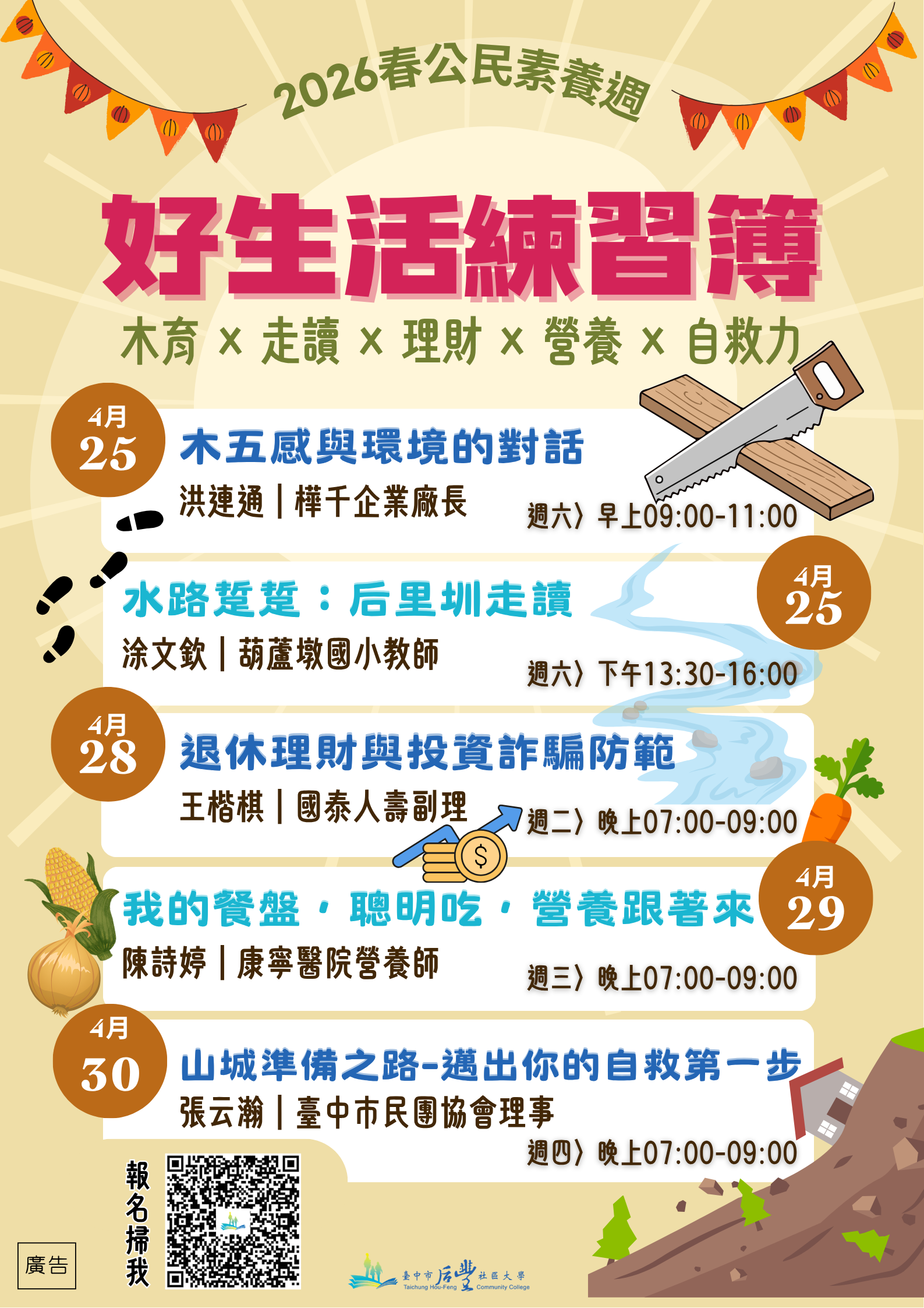 一、場次皆免費參與,詳細內容請參閱后豐社區大學公民素養週報名頁面(https://forms.gle/A39mL5omQUEWjNM1A)或電洽承辦人。