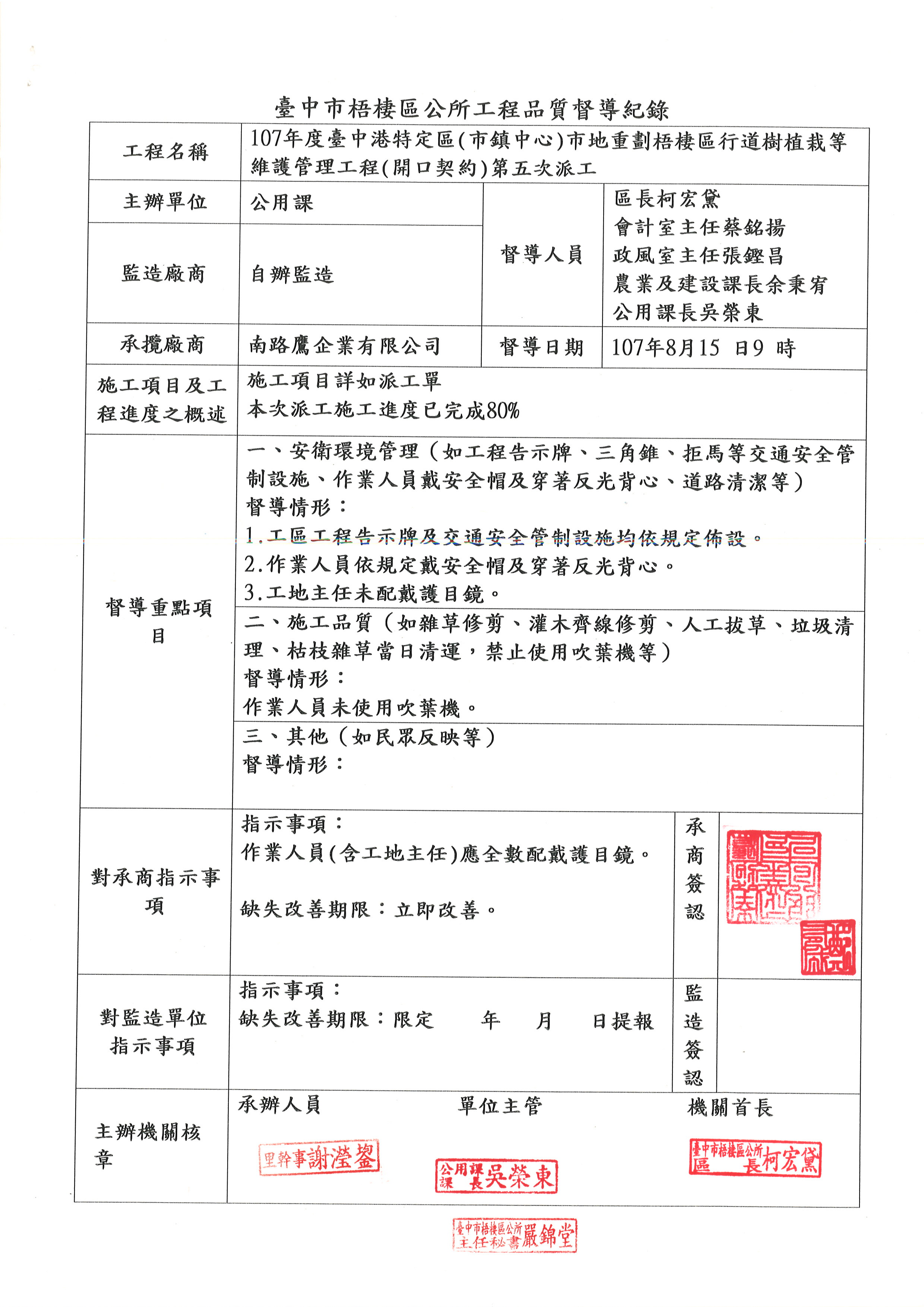 107年度臺中港特定區(市鎮中心)市地重劃梧棲區行道樹植栽等維護管理工程(開口契約)工程品質督導紀錄